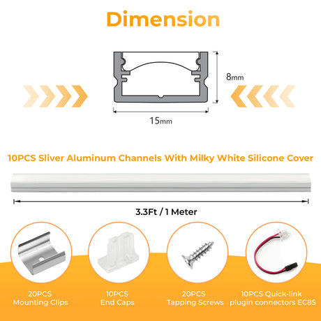APE2 LED Aluminum Profile 10 Packs 3.3ft with Silicone Covers and 10 Quick-Link Plugin Connectors for Mini Cut/Free Cut 8mm PCB Width LED Strip Light Cabinet Lighting